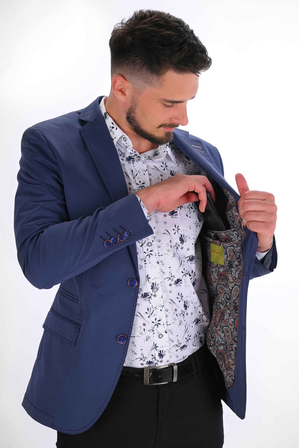 Modré sako s mikrovzorom SLIM STRIH, bavlna stretch