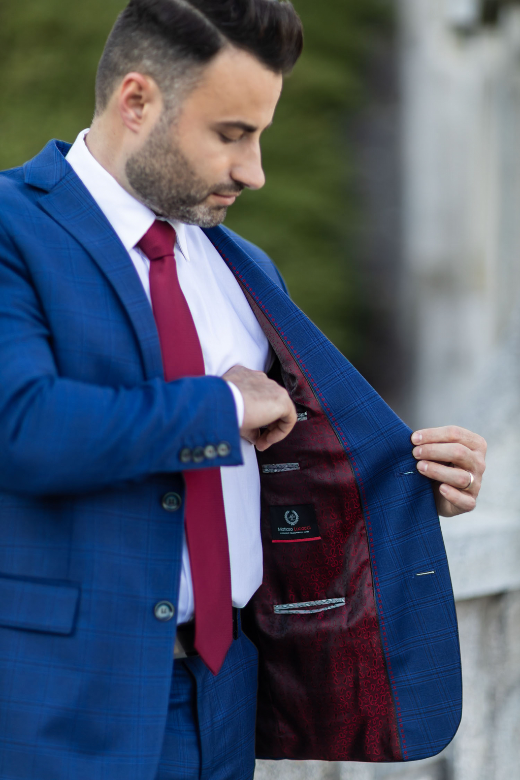 Károvaný oblek modrej farby SLIM STRIH, klasický