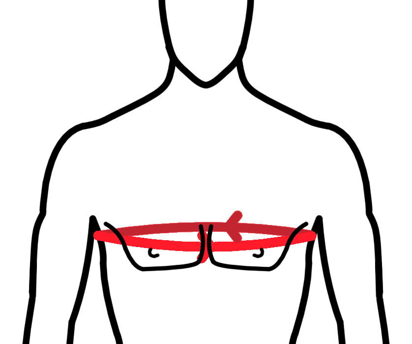 Merať obvod hrude popod pazuchy cez najväčšiu výstuplosť hrudníka a lopatiek, s podložením prsta pod meradlo.
